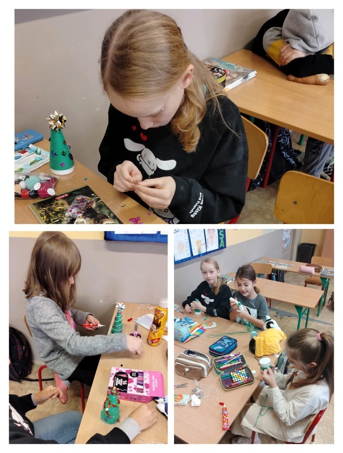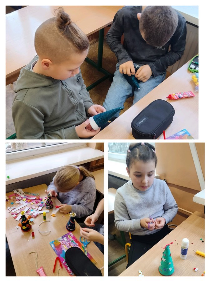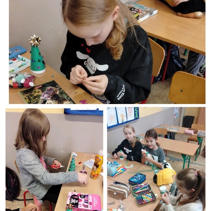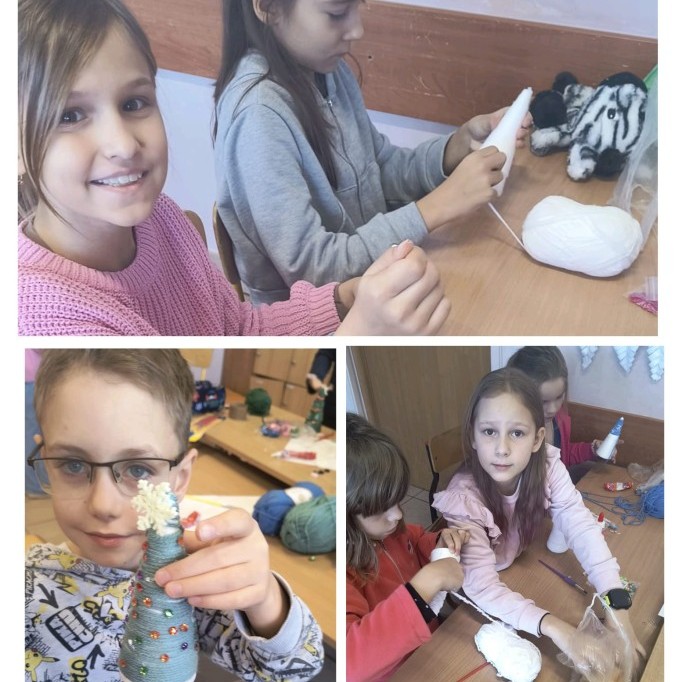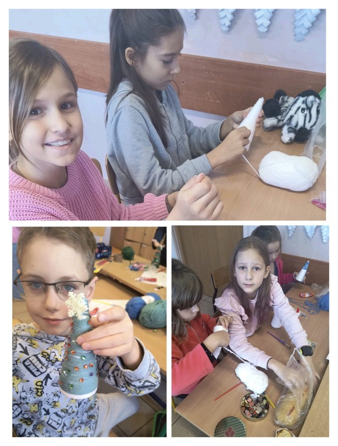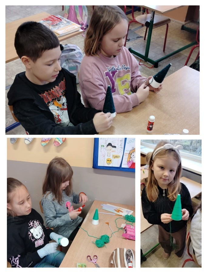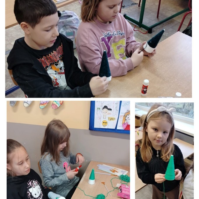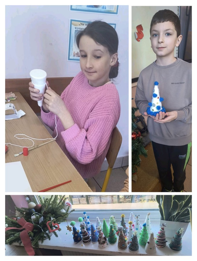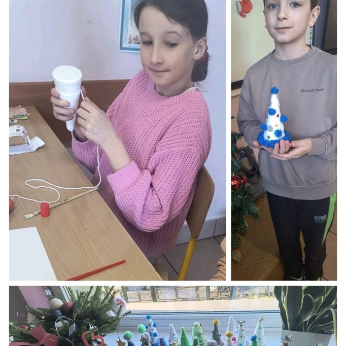 Uczniowie klas 3b i 3c stworzyli piękne choinki. Były to prace wymagające wiele cierpliwości – dzieci najpierw samodzielnie owijały choinki włóczką, a następnie ozdabiały je według własnych pomysłów, wykazując się dużą kreatywnością.