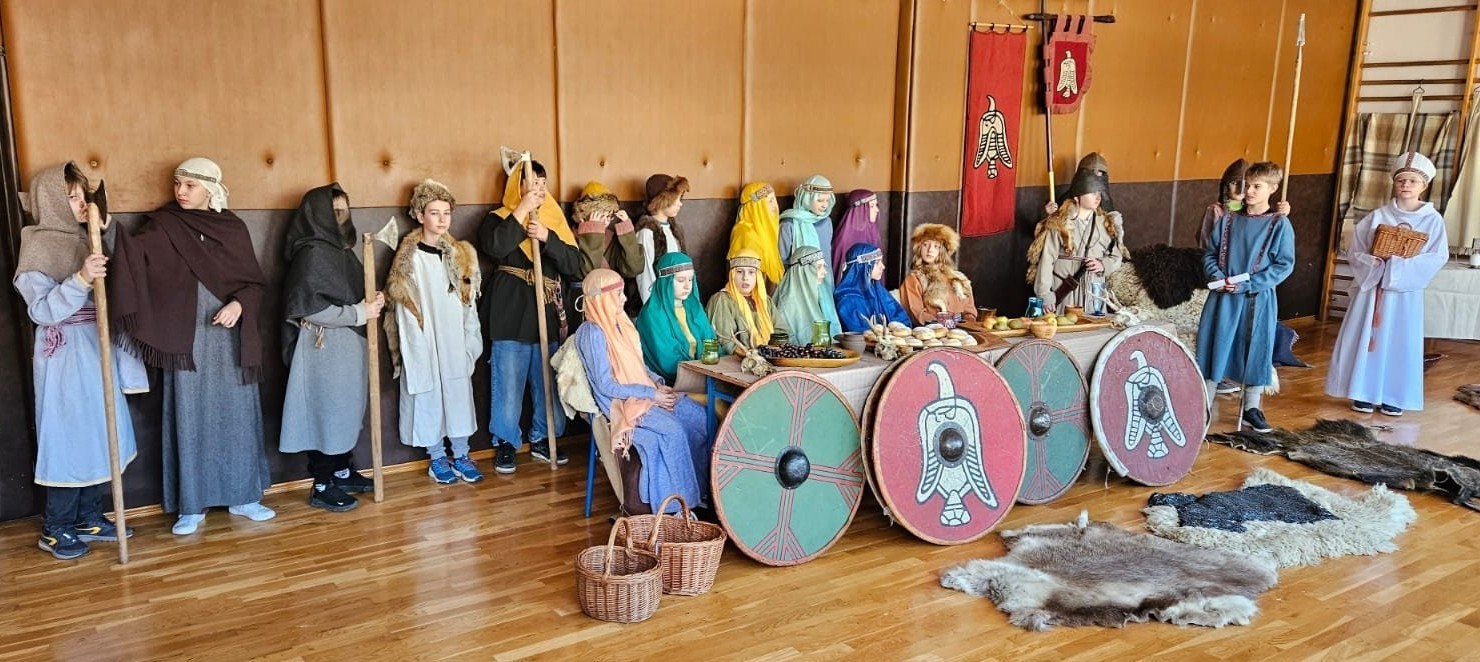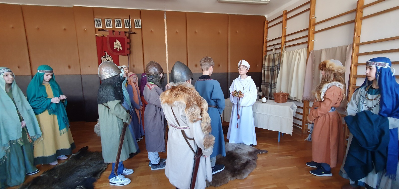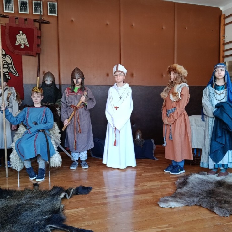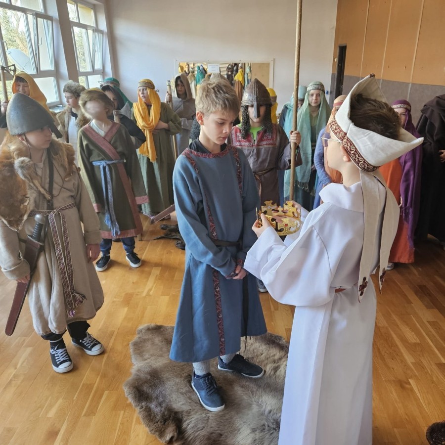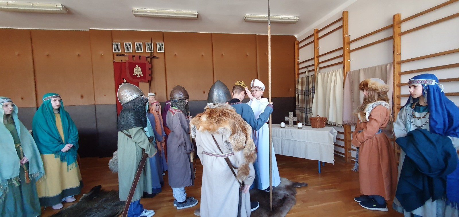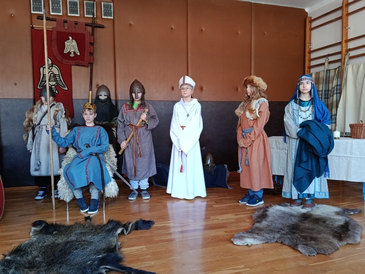 Dzięki pasji Pani Joanny A., wiedzy i ogromnemu zaangażowaniu sala gimnastyczna zamieniła się w prawdziwy średniowieczny dwór. Rodzice uczennicy przygotowali imponującą scenografię z tronem, insygniami królewskimi i barwnymi chorągwiami. Zadbano również o wierne historycznie stroje, detale oraz klimat epoki, co sprawiło, że mogliśmy przenieść się myślami do czasów pierwszych Piastów.