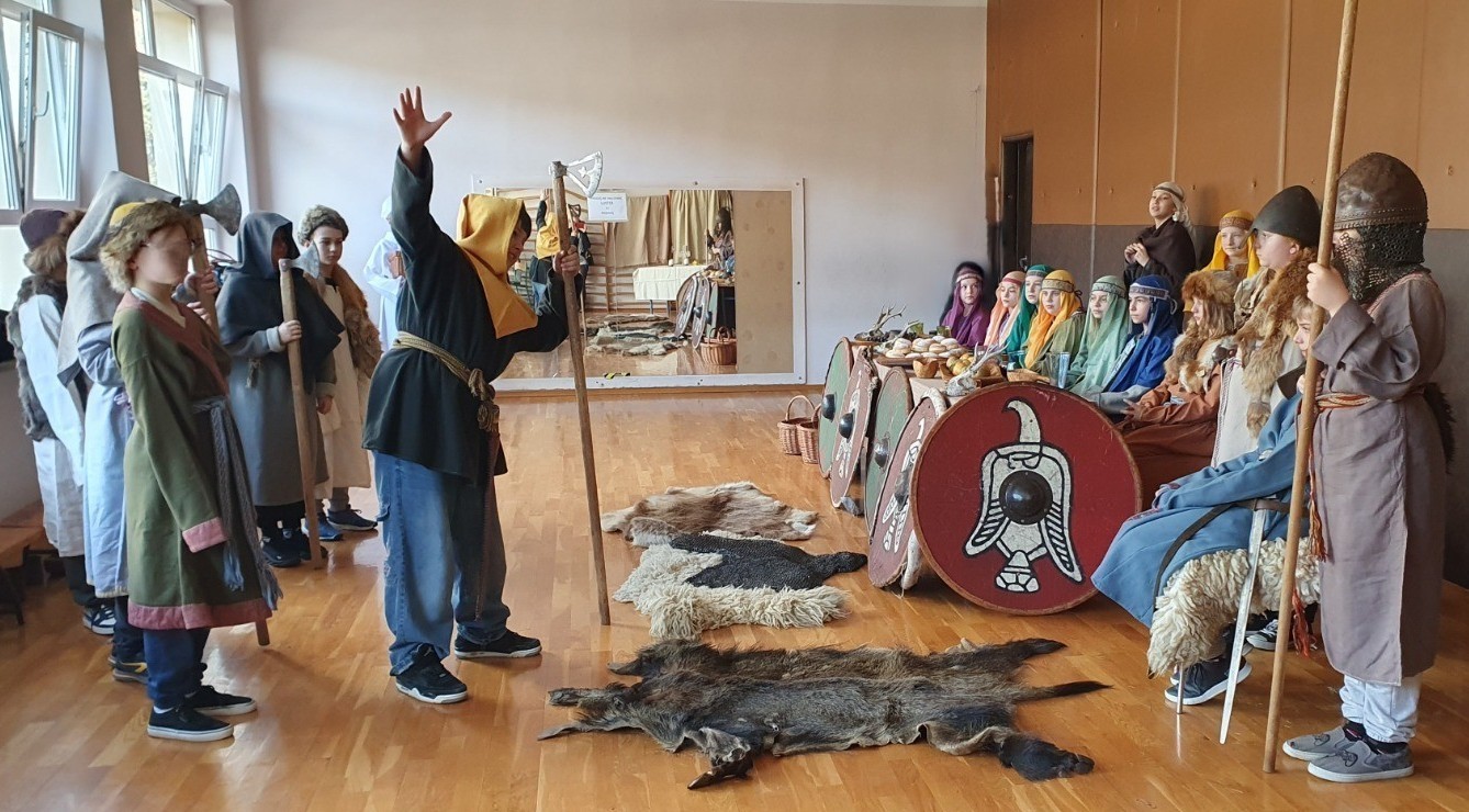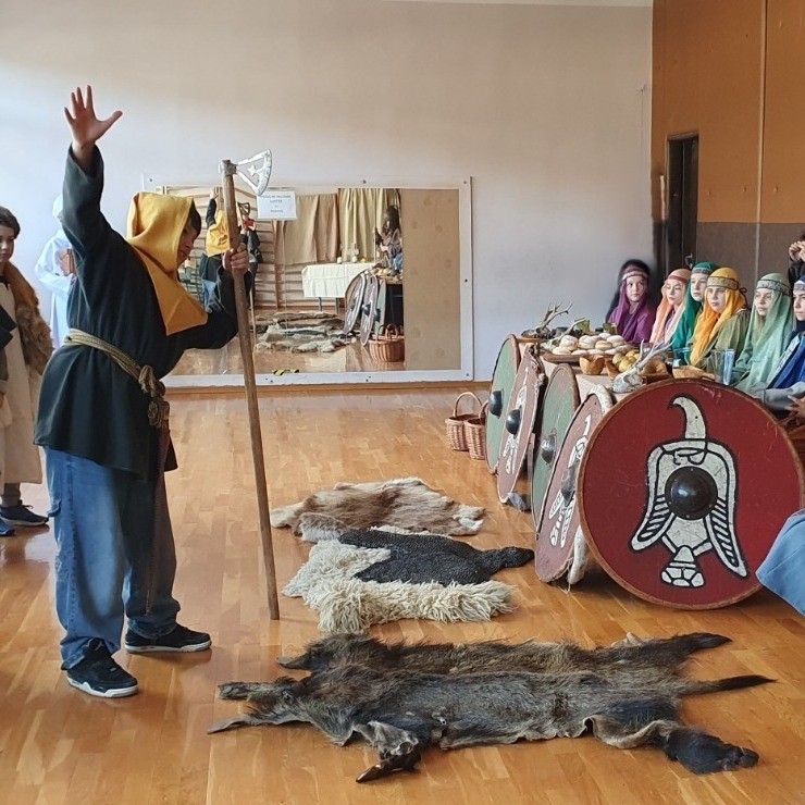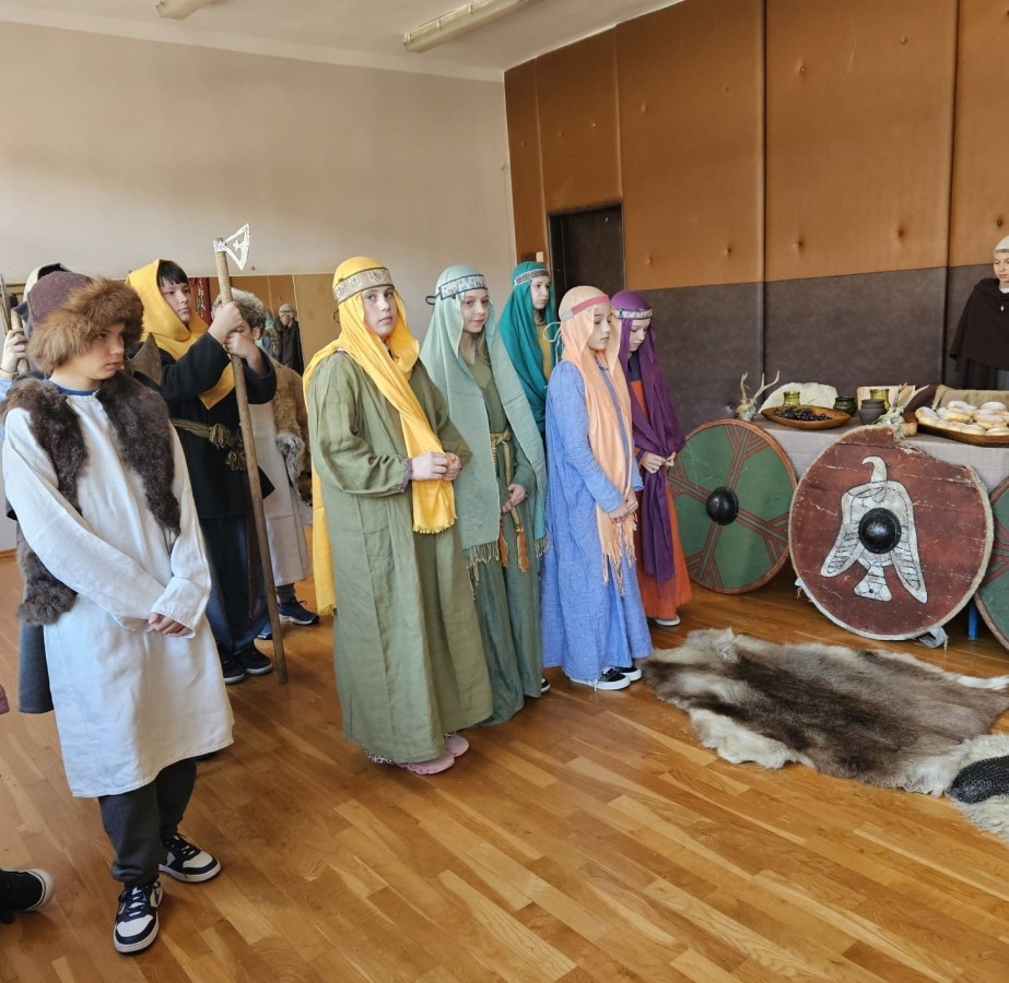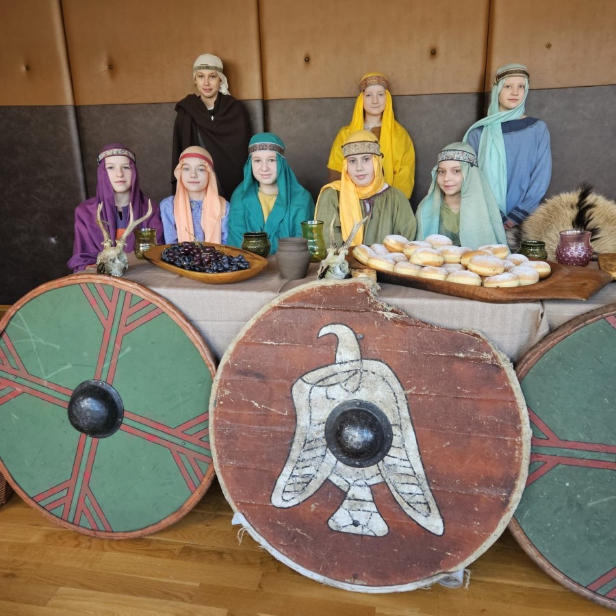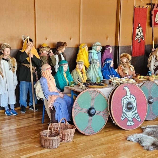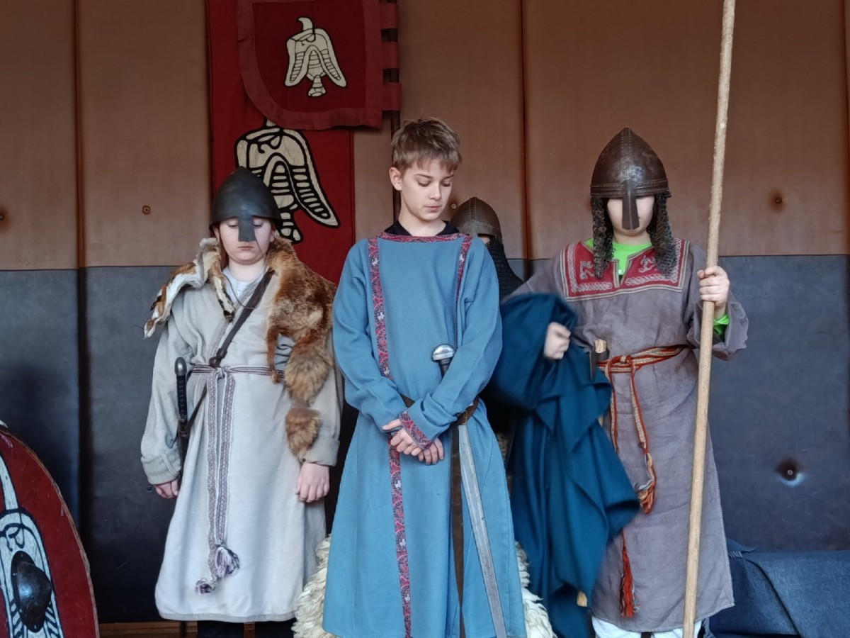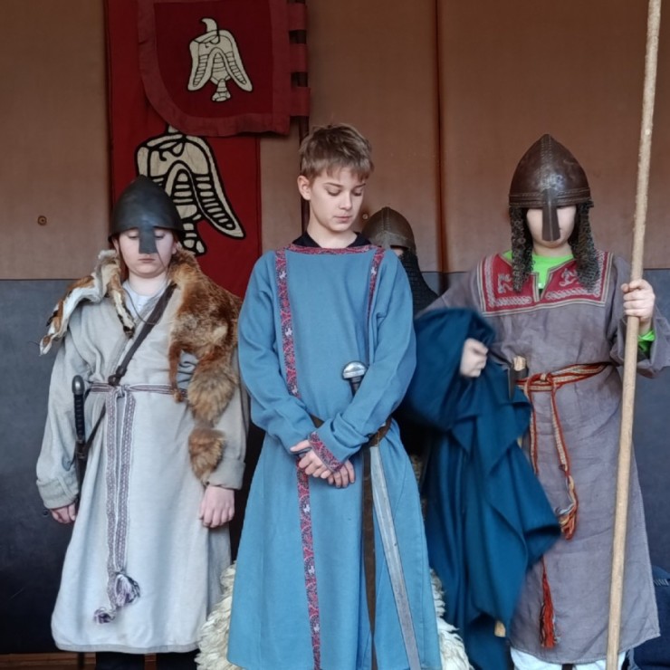 Dzięki pasji Pani Joanny A., wiedzy i ogromnemu zaangażowaniu sala gimnastyczna zamieniła się w prawdziwy średniowieczny dwór. Rodzice uczennicy przygotowali imponującą scenografię z tronem, insygniami królewskimi i barwnymi chorągwiami. Zadbano również o wierne historycznie stroje, detale oraz klimat epoki, co sprawiło, że mogliśmy przenieść się myślami do czasów pierwszych Piastów.