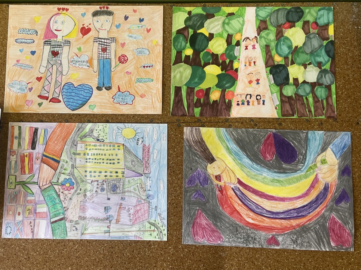 Uczniowie klas I–III przygotowali prace plastyczne pod hasłem „Kolorowy świat przyjaźni – bez kłótni i przemocy”, ukazujące wartość relacji opartych na życzliwości.