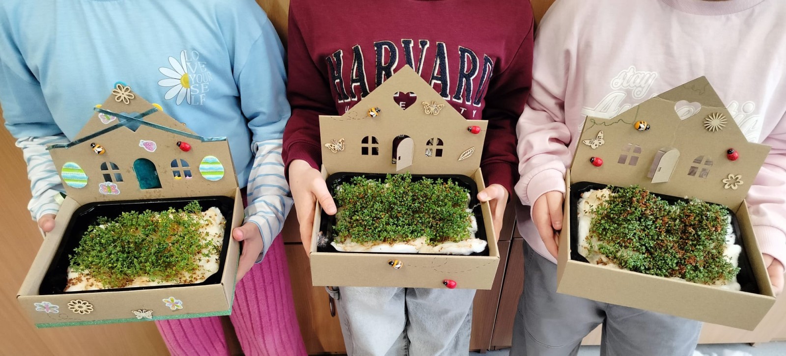 W ostatnich dniach uczniowie klas 1a, 1c, 2a, 2c, 3a, 3b, 3c wzięli udział w warsztatach ekologicznych „EkoDomek – sianie rzeżuchy”.