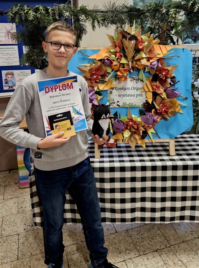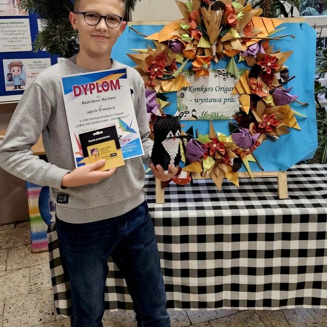 Zakończył się VIII Szkolny Konkurs Origami „Origami modułowe – zwierzęta”, skierowany do uczniów klas I–VIII. Uczestnicy zaprezentowali niezwykle pomysłowe i starannie wykonane prace, stworzone techniką origami modułowego – zarówno indywidualnie, jak i zespołowo. Jury oceniało m.in. oryginalność, estetykę, kompozycję oraz dobór kolorów i papieru. Najlepsze prace zostały nagrodzone dyplomami i nagrodami rzeczowymi oraz zaprezentowane na wystawie pokonkursowej. Konkurs po raz kolejny udowodnił, że origami to nie tylko sztuka, ale także doskonały sposób na rozwijanie kreatywności i precyzji.
