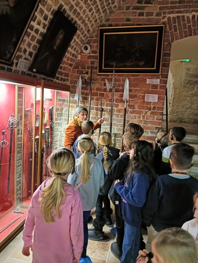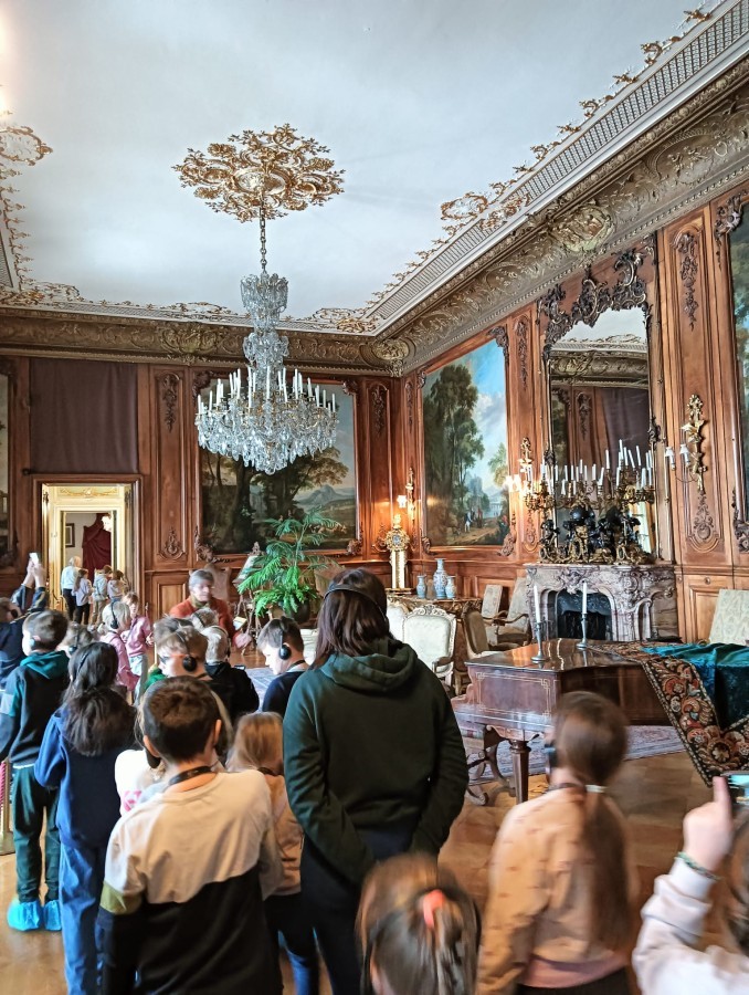 Zwiedzanie poprowadziły niezwykle sympatyczne i kompetentne panie przewodniczki, które w ciekawy sposób opowiadały o dziejach pałacu, jego dawnych właścicielach oraz codziennym życiu w rezydencji. Dzięki ich zaangażowaniu uczniowie mogli nie tylko zobaczyć piękne komnaty, ale także poznać wiele fascynujących ciekawostek związanych z tym miejscem.